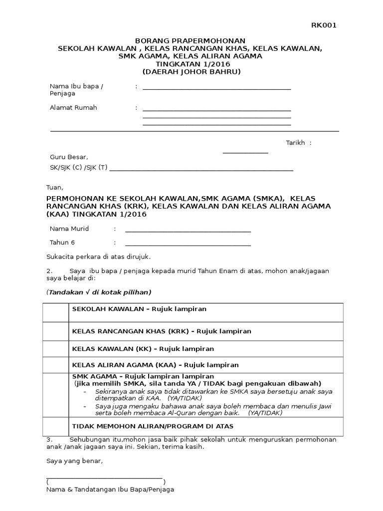 Web Contoh surat rayuan permohonan ke sekolah kawalan kelas. Web Untuk makluman permohonan Sekolah Kawalan Tingkatan 1 tahun 2021 bagi kemasukan SMKA KRK KAA SABK dibuka pada 7 September hingga 2 Oktober 2020. Web Ibu bapa dan penjaga yang telah mengemukakan permohonan kemasukan ke Sekolah Kawalan Tingkatan 1 Kementerian Pendidikan Malaysia KPM untuk anak jagaan.